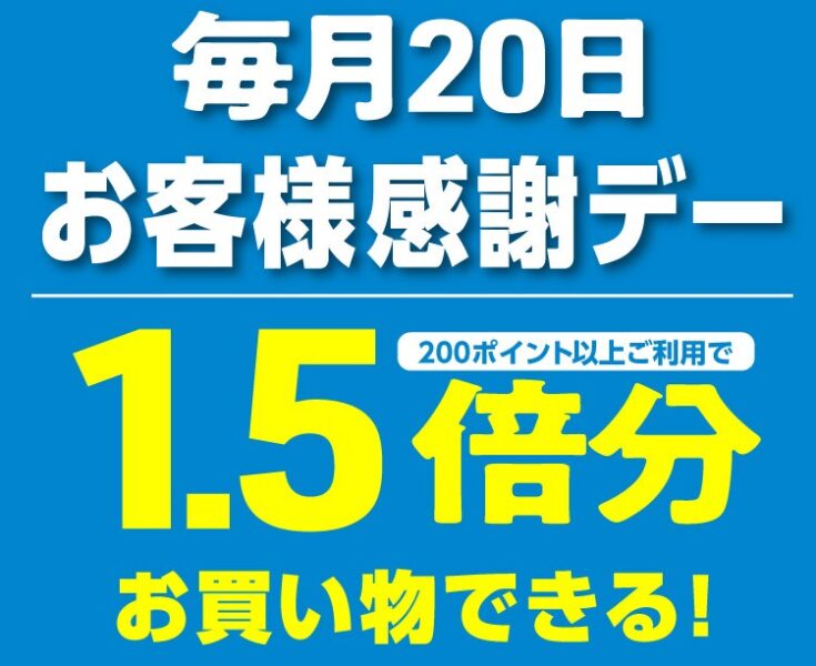毎月20日の「お客様感謝デー」はポイントの価値が1.5倍になって、1,000ポイントで1,500円分の買い物ができるんです。